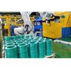 Cable coil stacking and palletizing system with robotic arm This palletizing system automates the transfer of full pallets from the working area and delivers empty pallets to the designated location, reducing the delivery time for each stacking process.