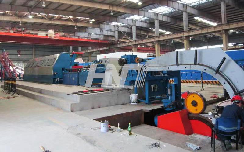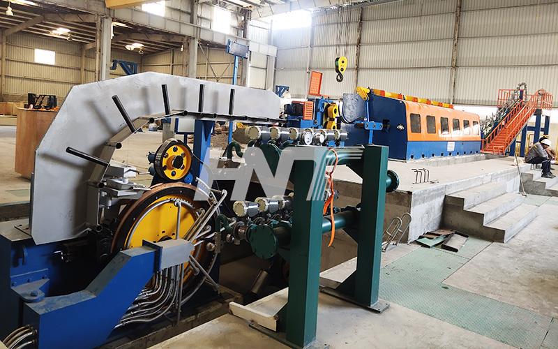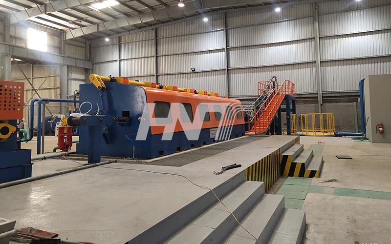 2. The production line is composed of the melting furnace, holding furnaces, four-wheel continuous casting machine, straightening machine, front traction, rolling shear machine, medium-frequency heating furnace, feeding machine, continuous mill machine, cooling system, take-up rod device, and electrical control system.